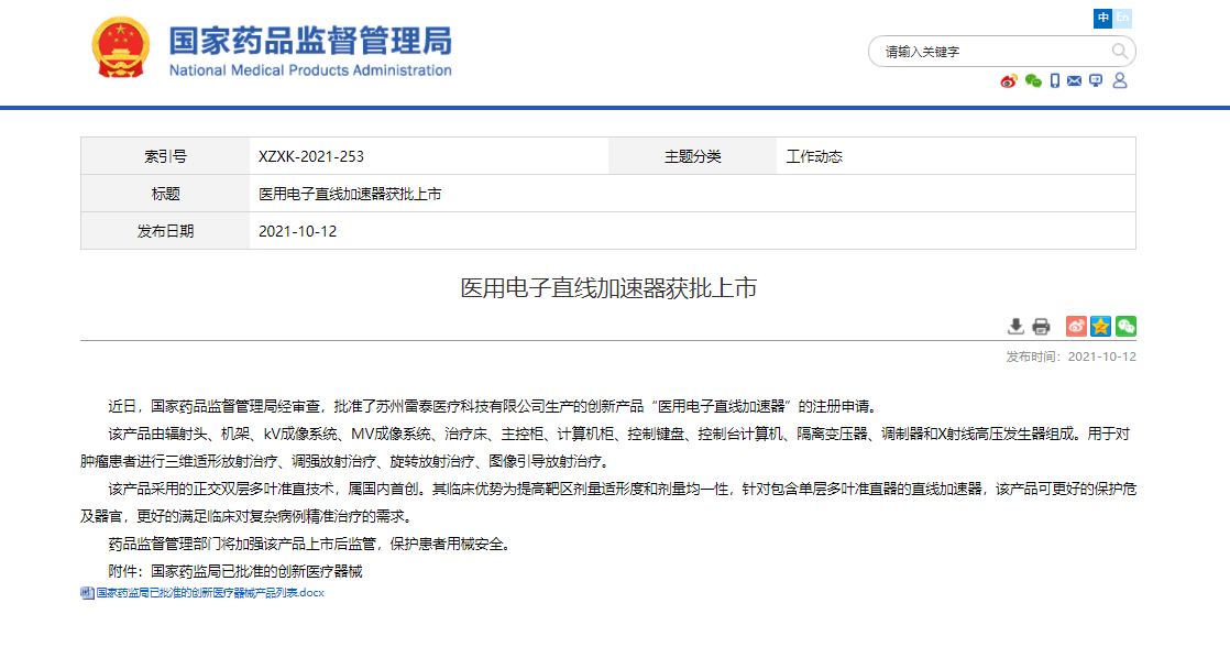据国家药品监督管理局10月12日消息,经审查,苏州纳米城企业—苏州雷泰医疗科技有限公司生产的创新产品“医用电子直线加速器”于近日通过注册申请,获批上市,国械注准20213050789。