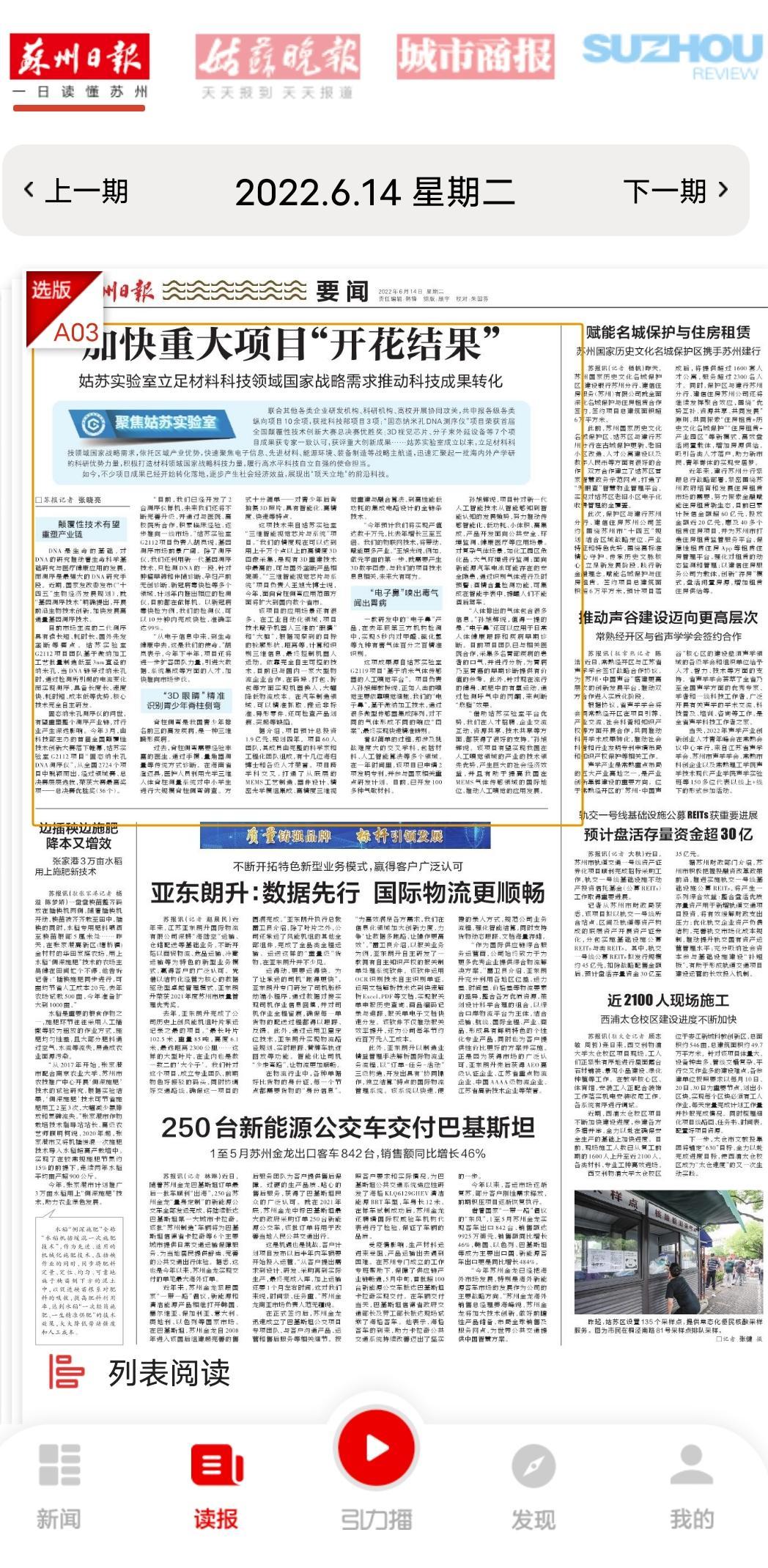 6月14日,苏州日报以《加快重大项目“开花结果” ,姑苏实验室立足材料科技领域国家战略需求推动科技成果转化》为题,报道姑苏实验室立足材料科技领域国家战略需求,依托区域产业优势,快速聚焦电子信息、先进材料、能源环境、装备制造等战略主航道,迅速汇聚起一批海内外产学研的科研优势力量,积极打造材料领域国家战略科技力量,履行高水平科技自立自强的使命担当。